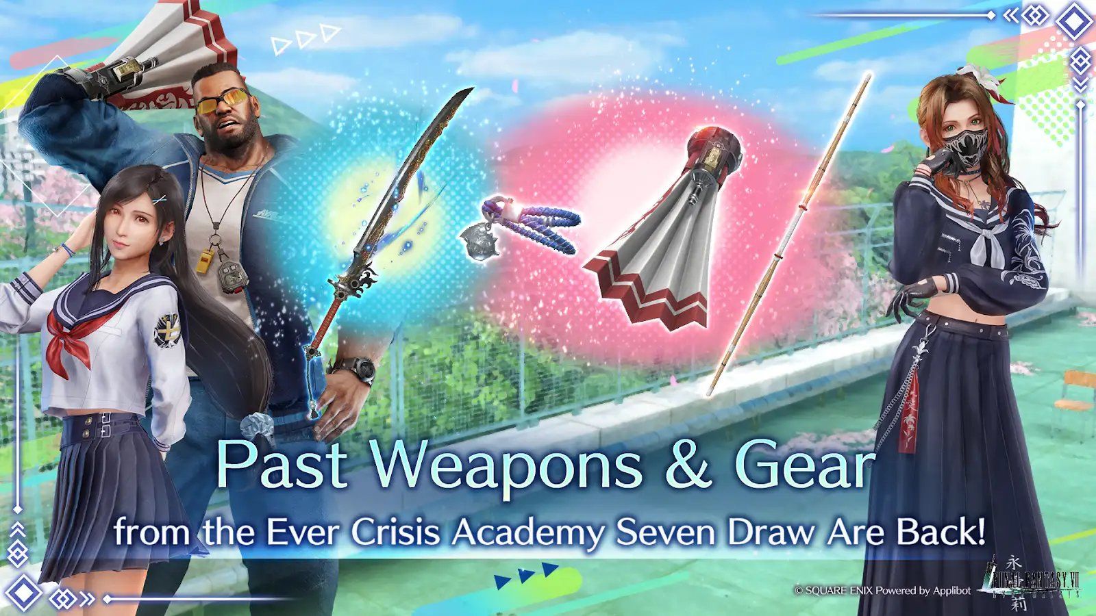 Baptisé FFVII Ever Crisis Academy Seven: Episode – Brawler AU, cet événement place les protagonistes de FF VII dans un lycée japonais, tel un univers alternatif, où Barret est le coach de baseball (son bras servant probablement à tirer des balles de baseball), et Aerith une délinquante cheffe de gang !